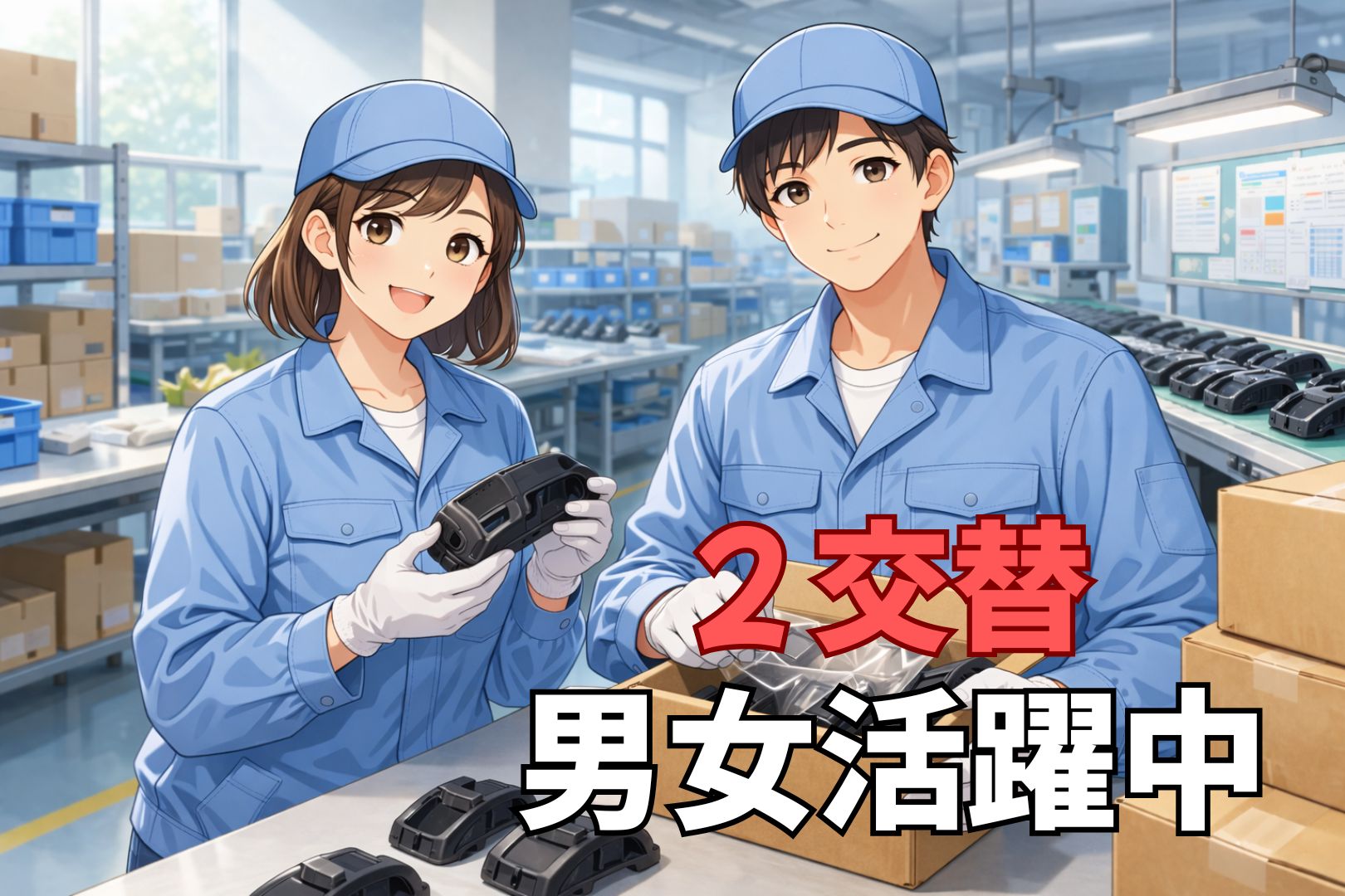 自動車に使われるプラスチック部品の検品・箱詰めが中心のお仕事です。 重量物は少なく、ラインに追われ続ける作業ではないため、落ち着いて取り組みたい方にもなじみやすい環境です。 未経験からスタートしやすく、工場勤務が初めての方にも取り組みやすい内容です。