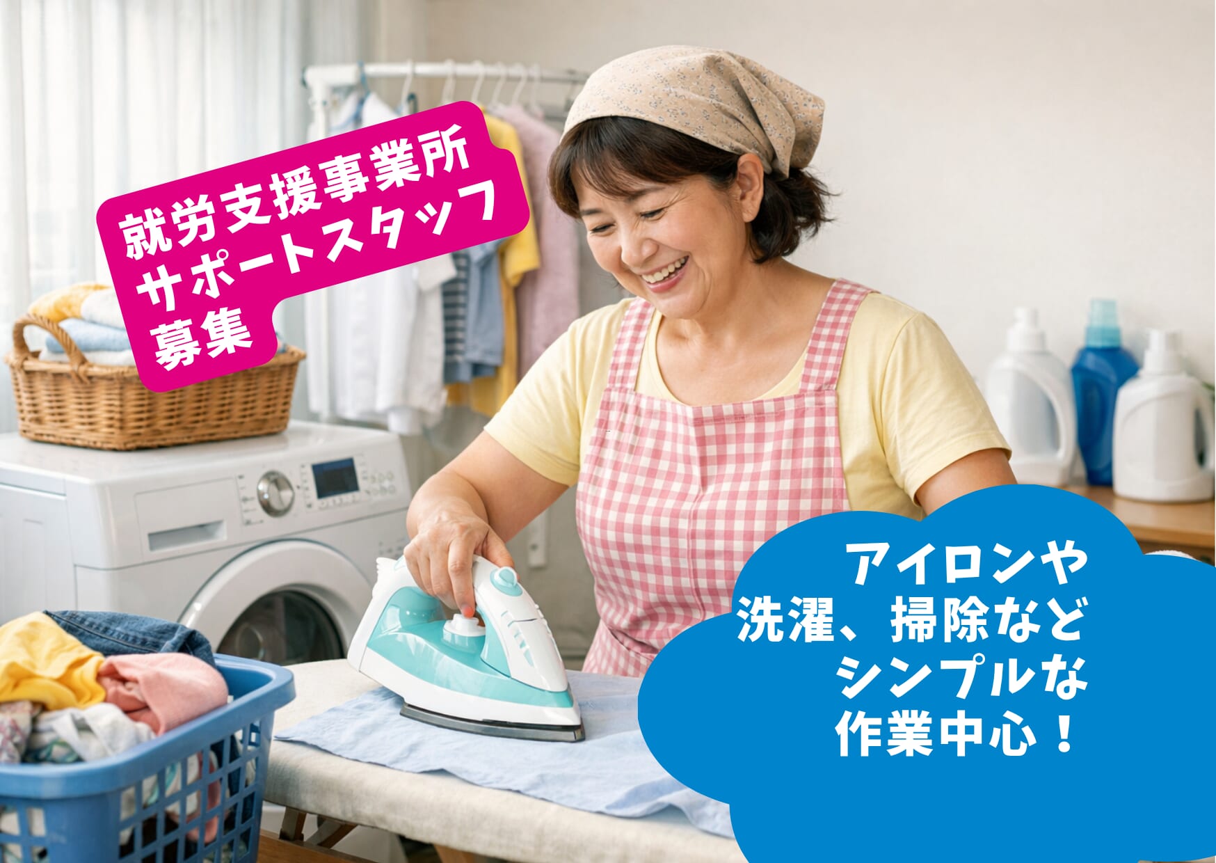 シニア活躍中!アイロンがけや洗濯や掃除などのシンプルな作業を通して、利用者さんの“働く”を支えるお仕事です! 人と関わるのが好きな方なら未経験でも大歓迎!日々、にぎやかに作業は進みます。