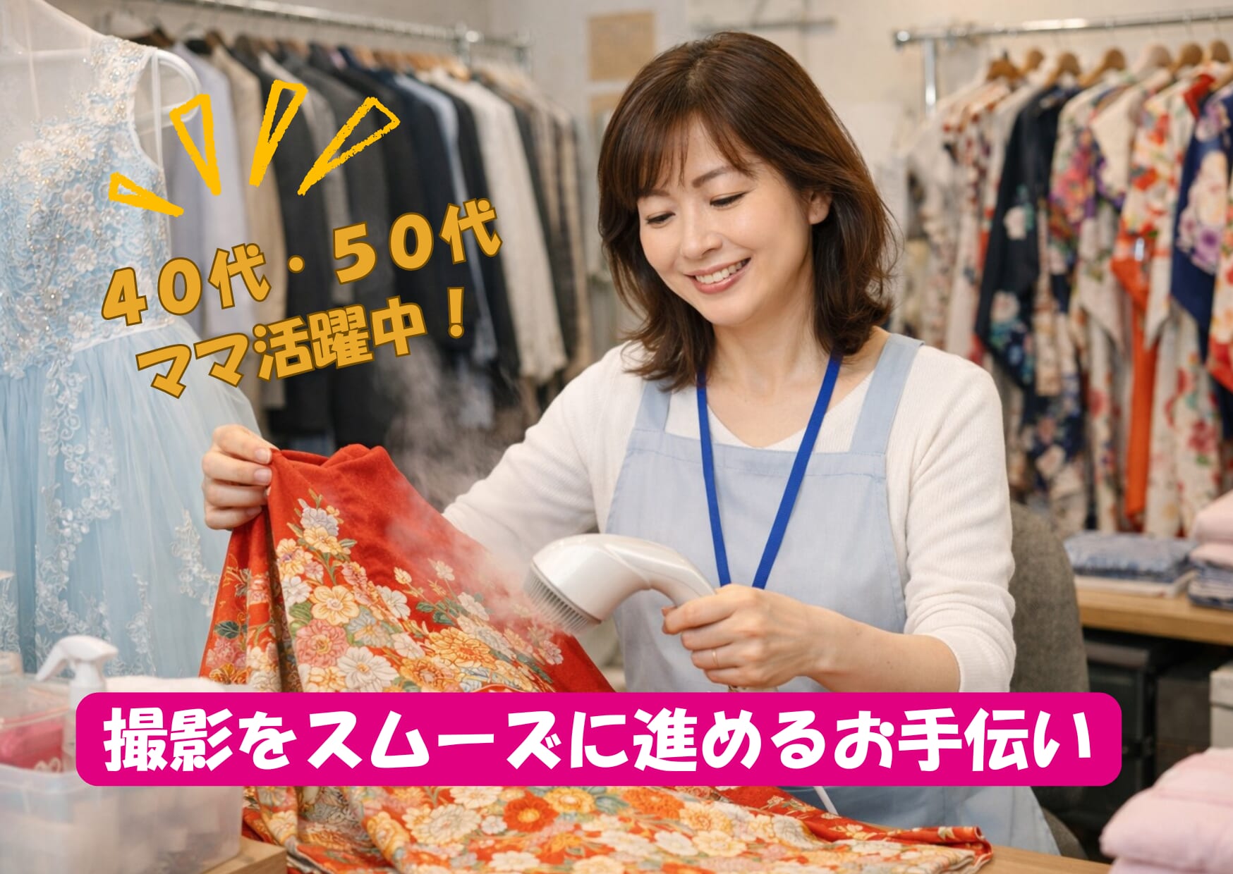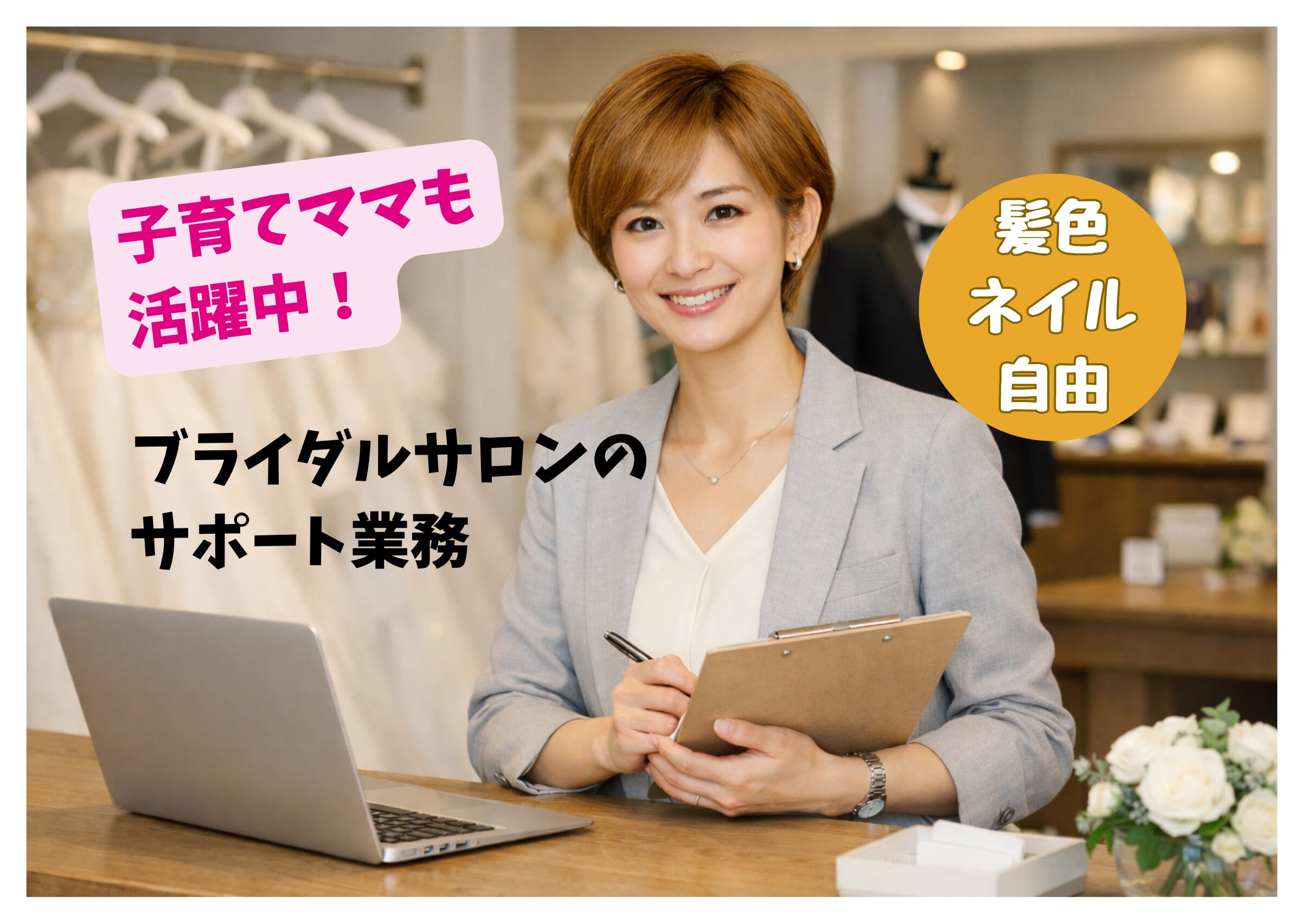 ドレスや振袖に囲まれて、幸せのお手伝い。 「好き」を活かして短時間で働く、サロン受付・サポート業務。