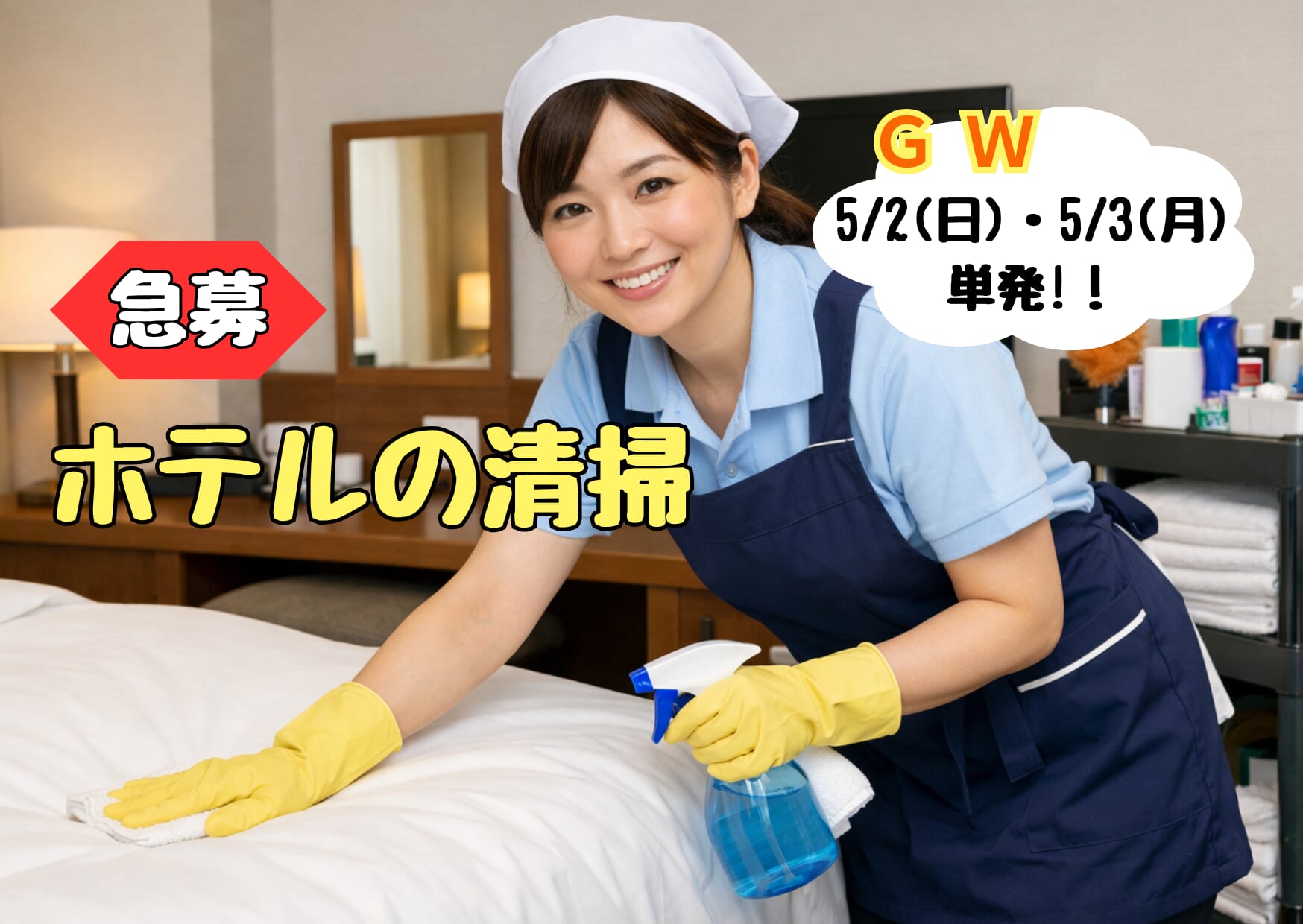 GW 5/3(日)・5/4(月) 10時~14時!決まり次第終了の人気のお仕事!!ビジネスホテルのシーツ替えと簡単な清掃です。