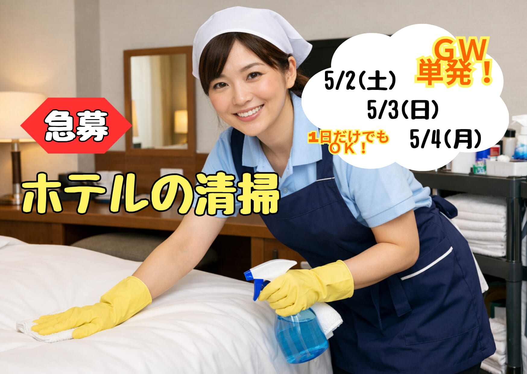 ゴールデンウィーク 5/2(土)・5/3(日)・5/4(月) 10時~14時!決まり次第終了の人気のお仕事!!ビジネスホテルのシーツ替えと簡単な清掃です。